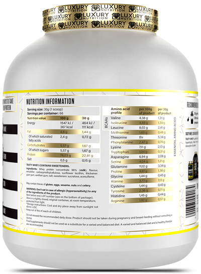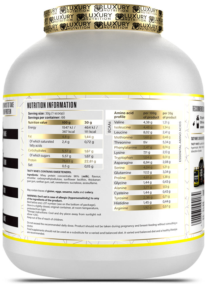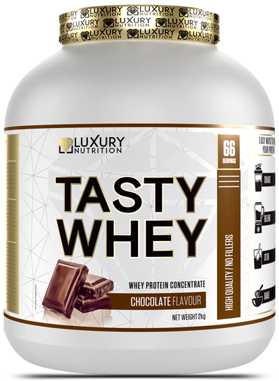 How to Use: Mix one (1) scoop (30g) of Luxury Nutrition Tasty Whey with 8-12 ounces of water or milk. Consume 1-2 servings daily, preferably after workouts or as a meal replacement. For optimal results, use in conjunction with a balanced diet and regular exercise routine.